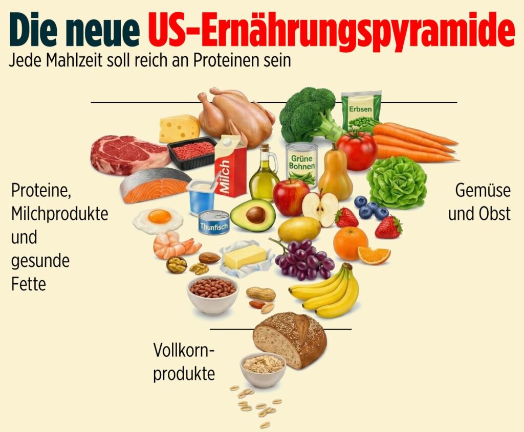 Dies wurde nun endlich auch vom amerikanischen Gesundheitsminister Robert F. Kennedy jr. beherzigt, und er hat die sattsam bekannte Ernährungspyramide auf den Kopf gestellt. Darin siehst du, dass Zerealien – insbesondere die hoch verarbeiteten – nur äußerst sparsam konsumiert werden sollten, während andere Lebensmittel, vor denen oft gewarnt wurde, nun ganz weit oben stehen.